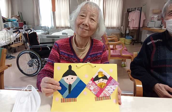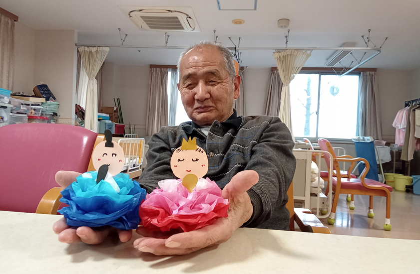 お花紙や色画用紙、折り紙を使ったおひな様も作っていただきました。