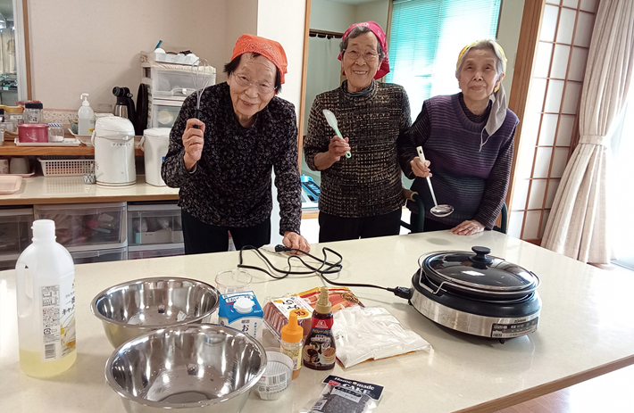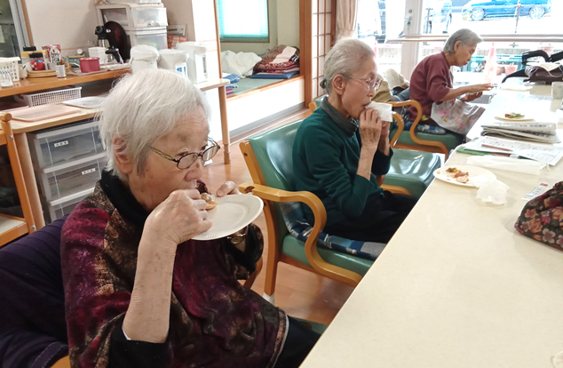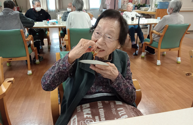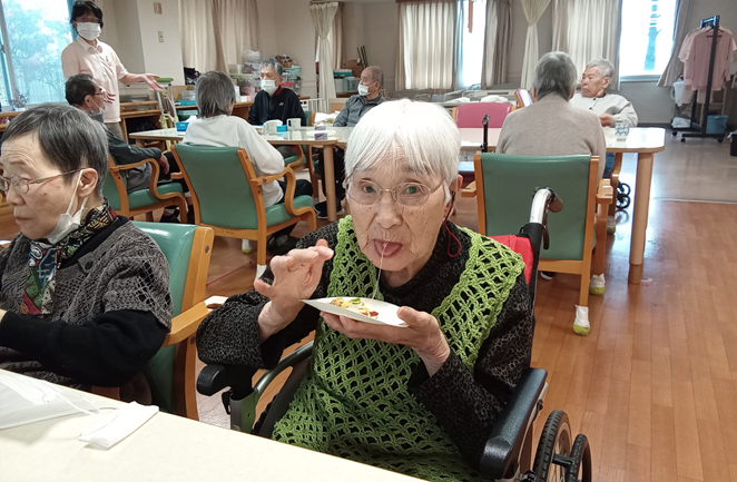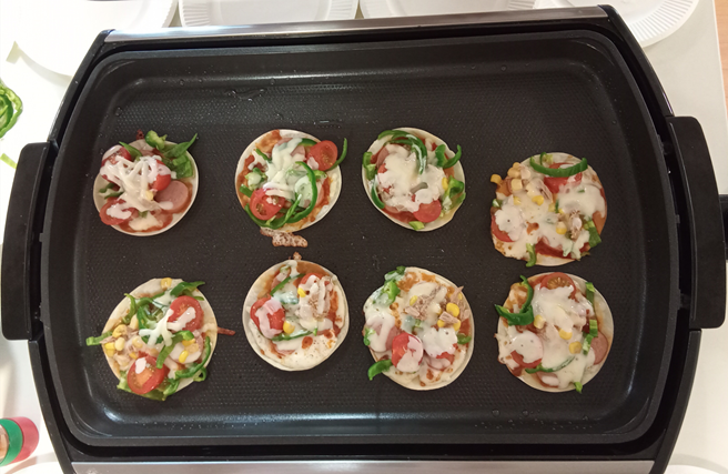 具材をカットし、ご自分でトッピングをしてホットプレートでじっくりと焼くと、あっという間に小さなピザが完成、おやつの時間に召し上がっていただきました。