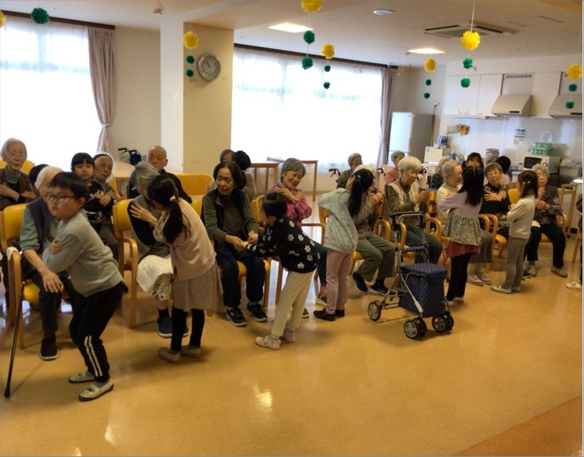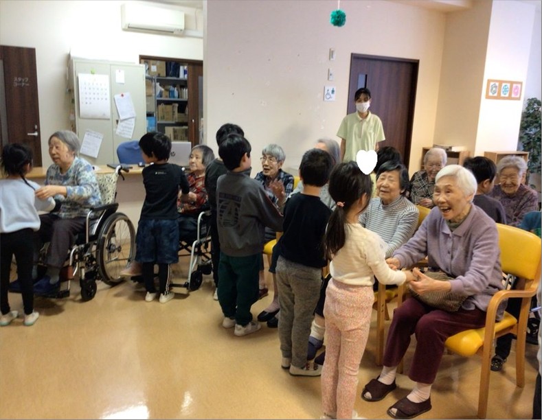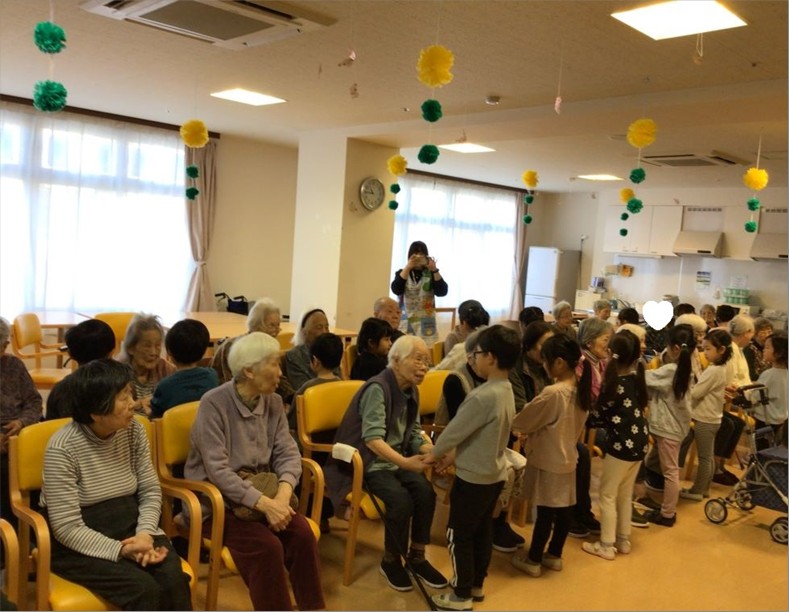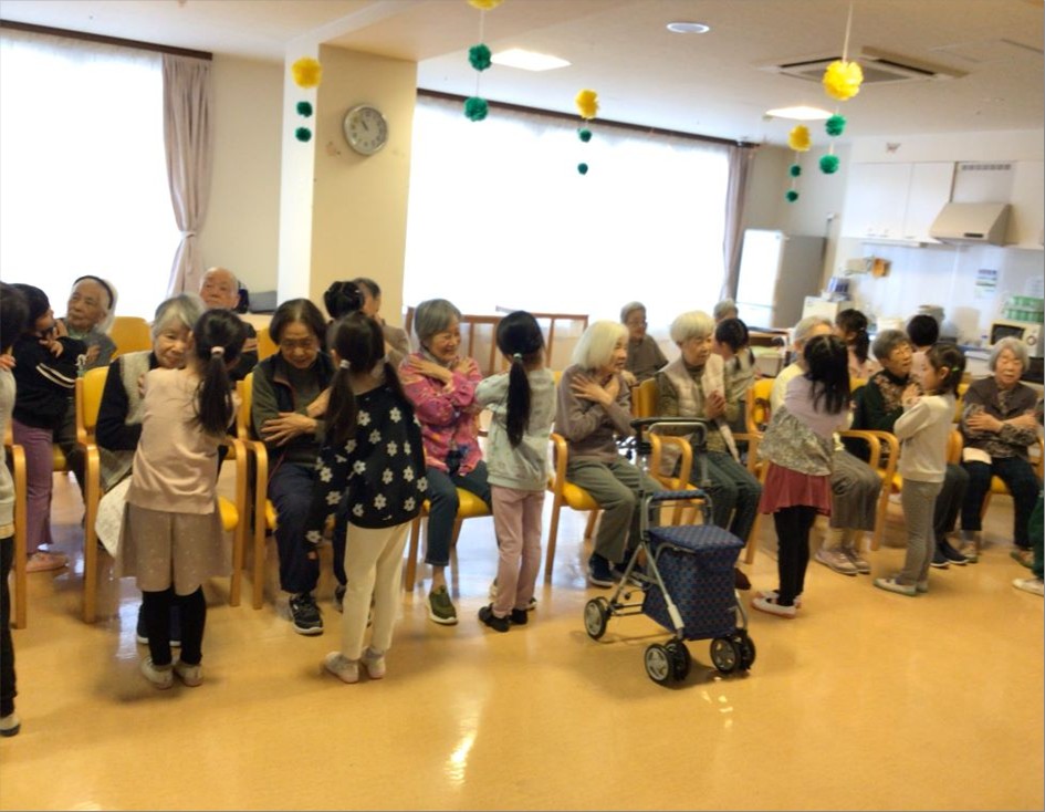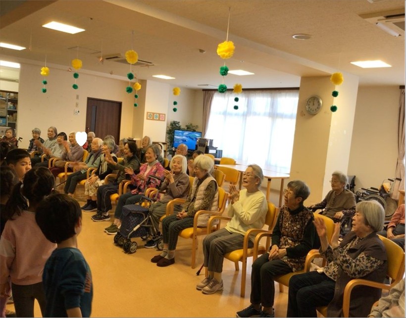 そして、入居者様と手を取り合いながら『おちゃらかほい』や『幸せなら手をたたこう』等を歌いながら手遊びをしてくれました🎶