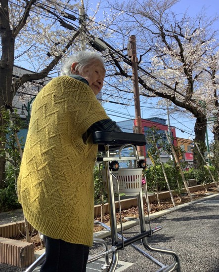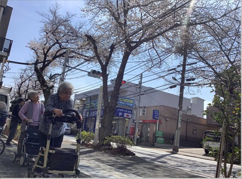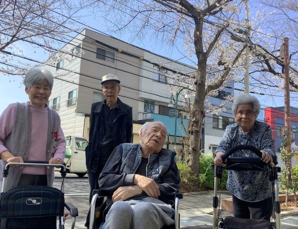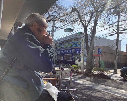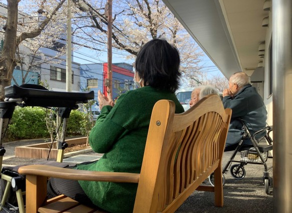 桜を見ながら入居者様がハーモニカを演奏していらっしゃいます。