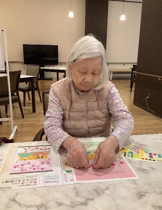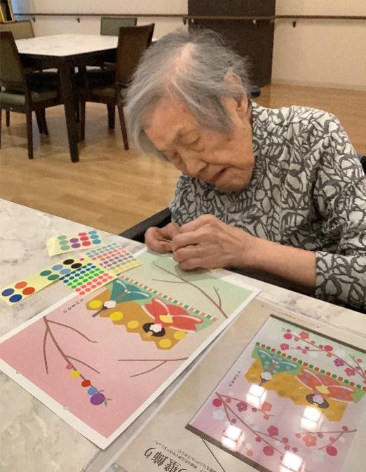 大小の色々なシールで着物の柄や木の枝、屏風に飾っていきます。特に決まりはないので「自由に貼ってください」と声をかけますが「自由って難しいわね」と手が進まなかったのですが、1つ貼ってみると次々貼り進め、集中して制作されていました。
