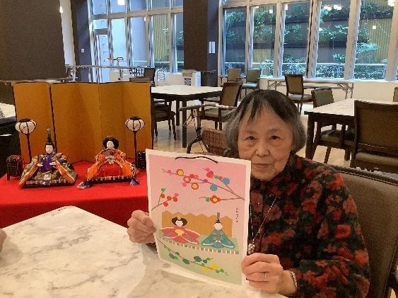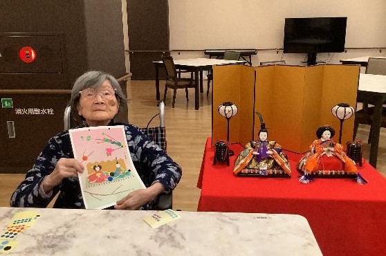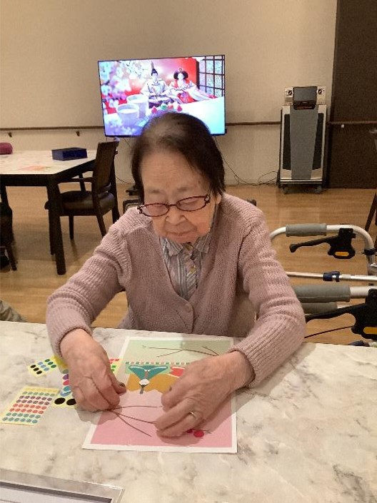 3月の製作アクティビティはひな飾り制作をしました。お内裏様の画にシールを使って飾りつけていきます。