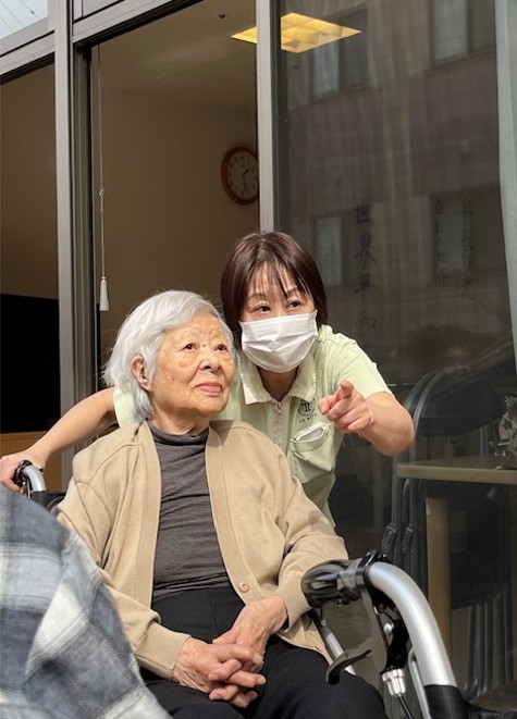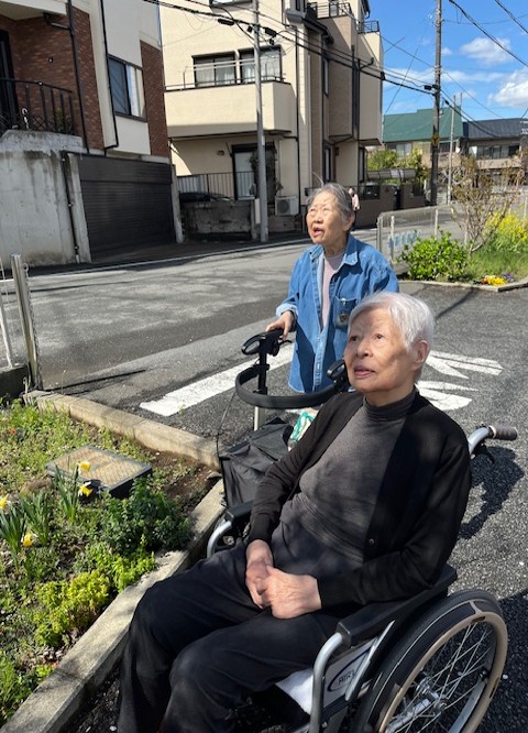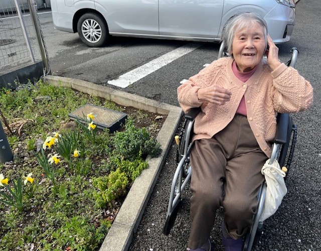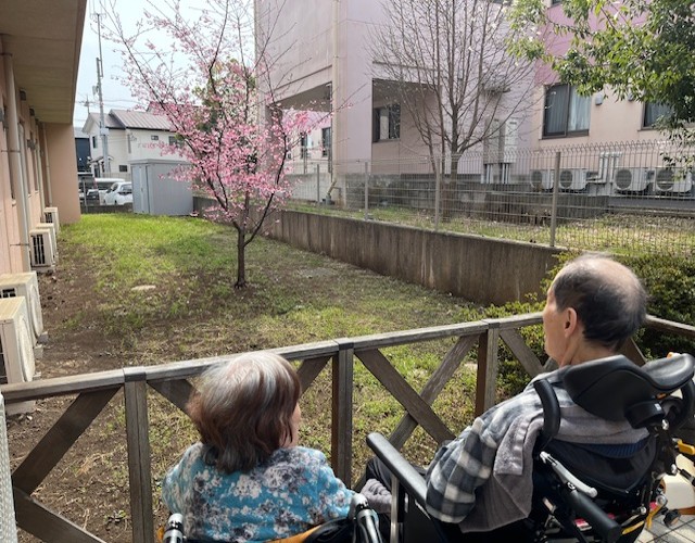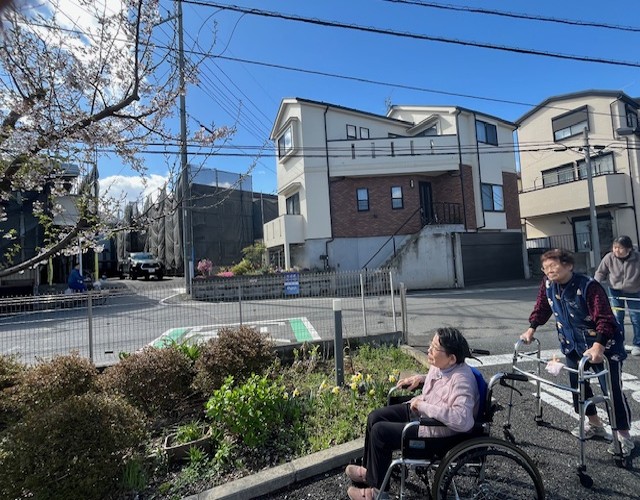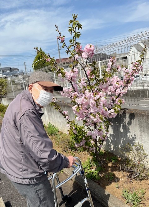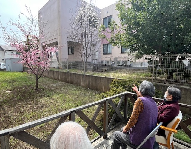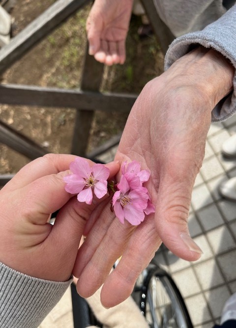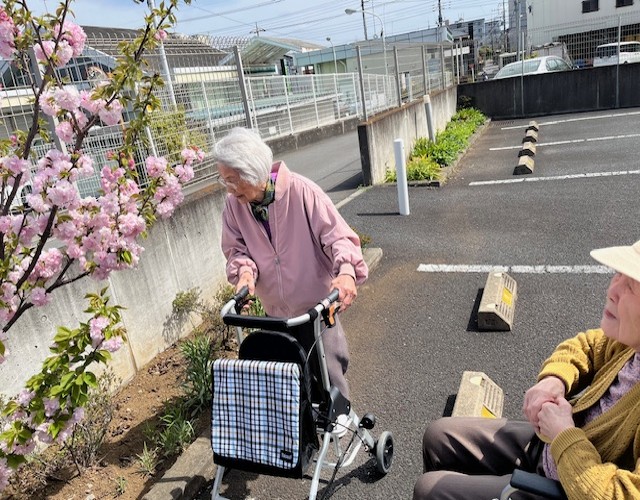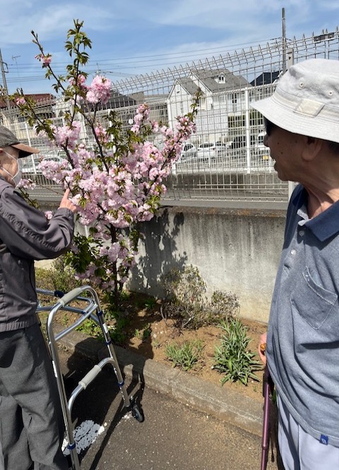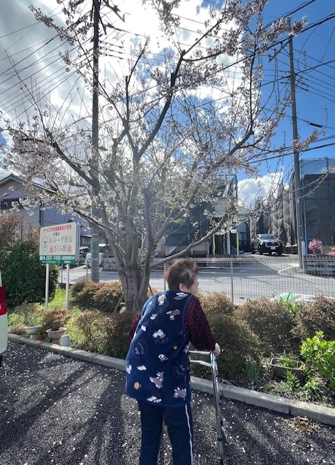 また、隣のさくら館にはソメイヨシノが1本咲いており、ドライブに行けなかった入居者様を連れて散歩がてら観に行ってきました!