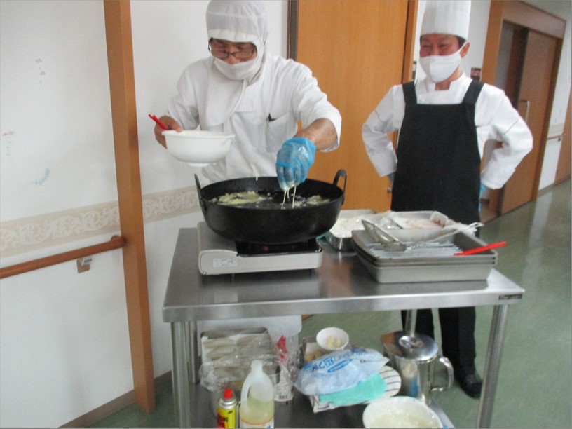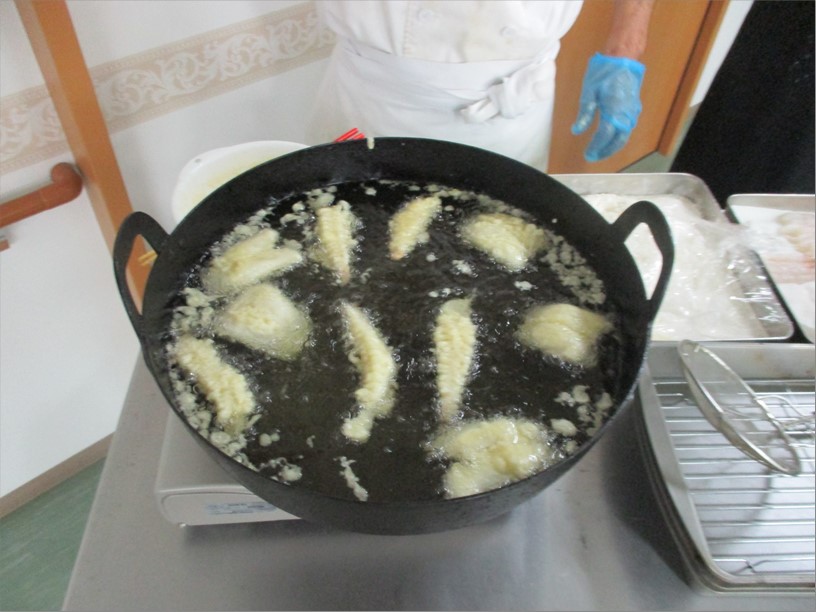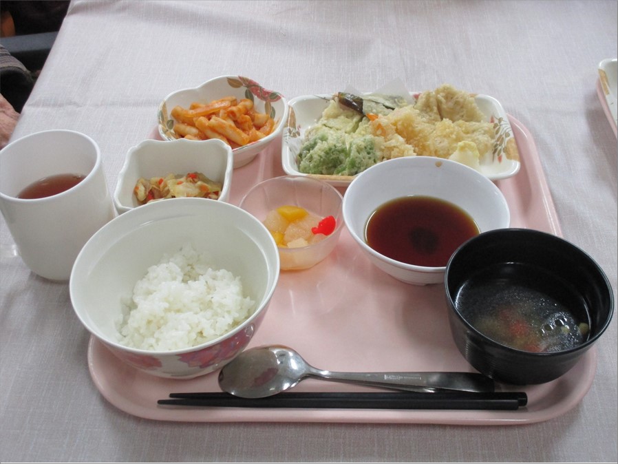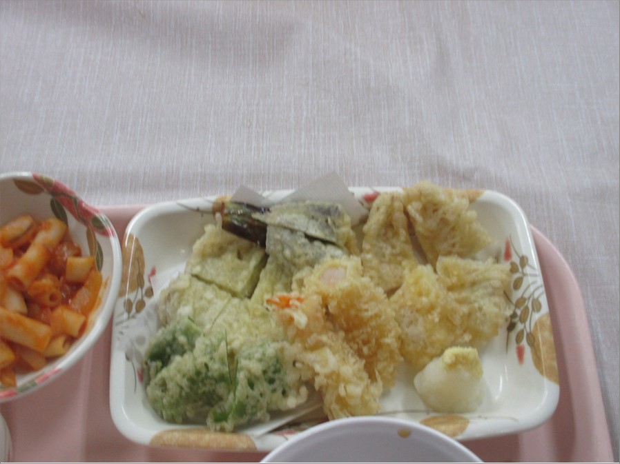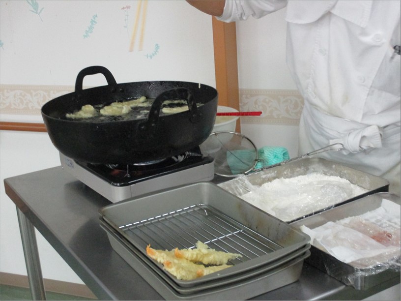 お食事の内容は、海老・キスの天ぷらを揚げ、揚げたてを満足いくまで食べていただきました。