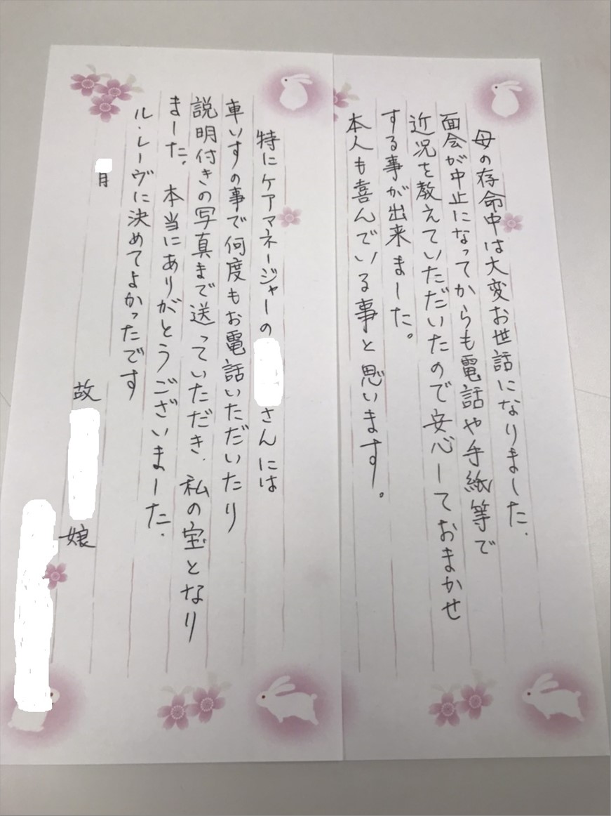 四十九日が過ぎたころ、ご家族様からこんな手紙が施設に届きました。