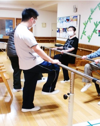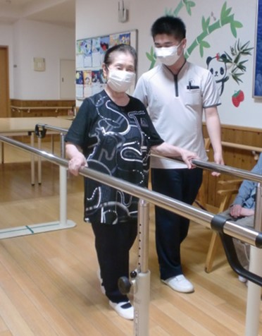 平行棒を使っての体操・歩行訓練の様子です。歩行訓練では、「見られてるとシャンッとするわね~」など話されていました。