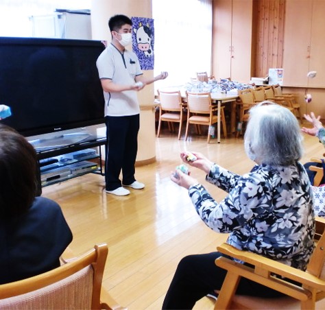 新聞紙を使った体操では、ご利用者様一人一人に新聞紙を丸めていただき、それぞれオリジナルのボールで体操に参加して頂きます。