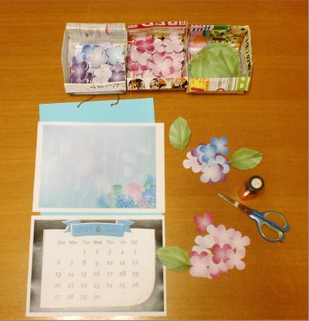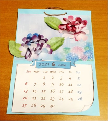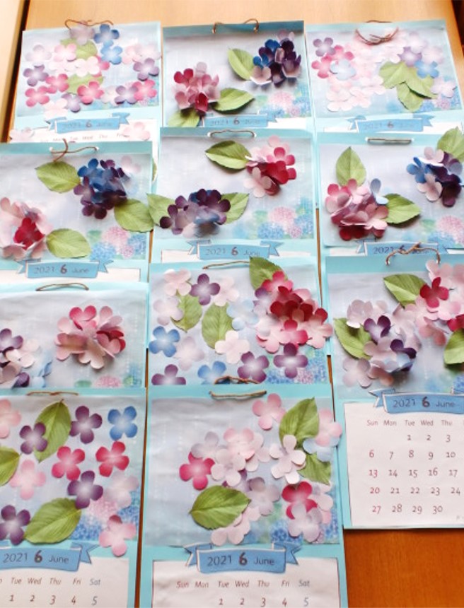 6月のカレンダーは、5月のカレンダーに続き皆様に大好評のお花シリーズから、梅雨を彩る紫陽花(あじさい)をモチーフとしたものを製作しました。