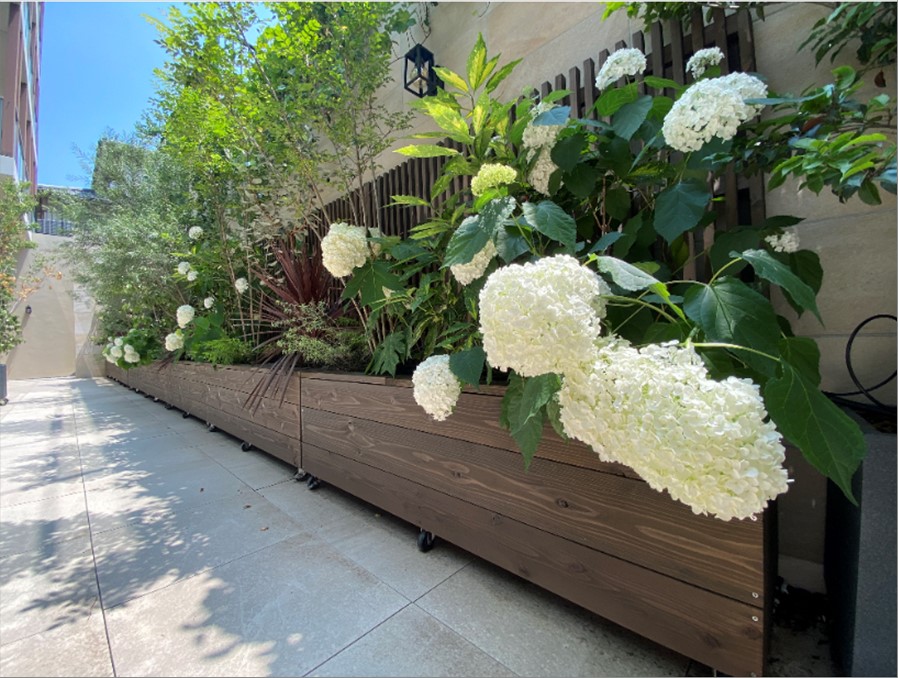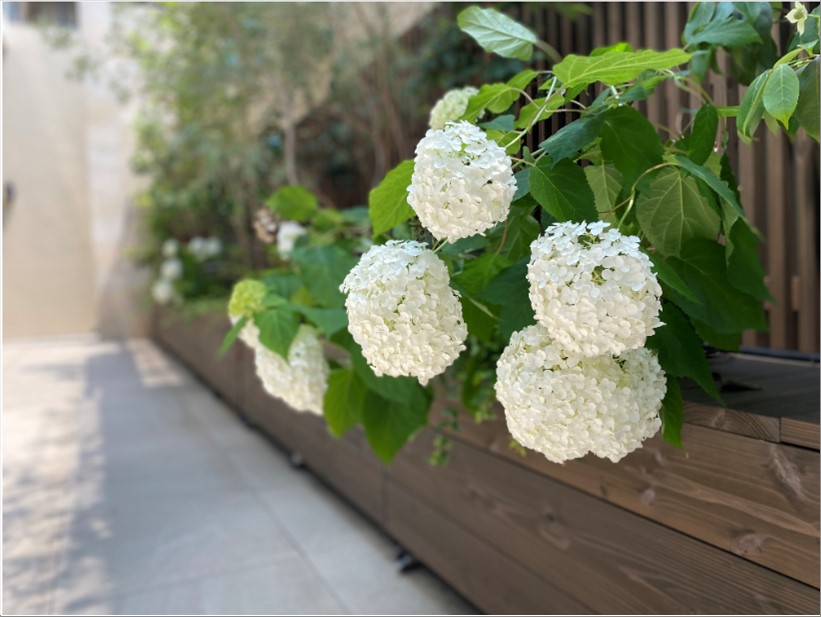サンクンガーデンにこの時期ならではの花、紫陽花が咲きました。