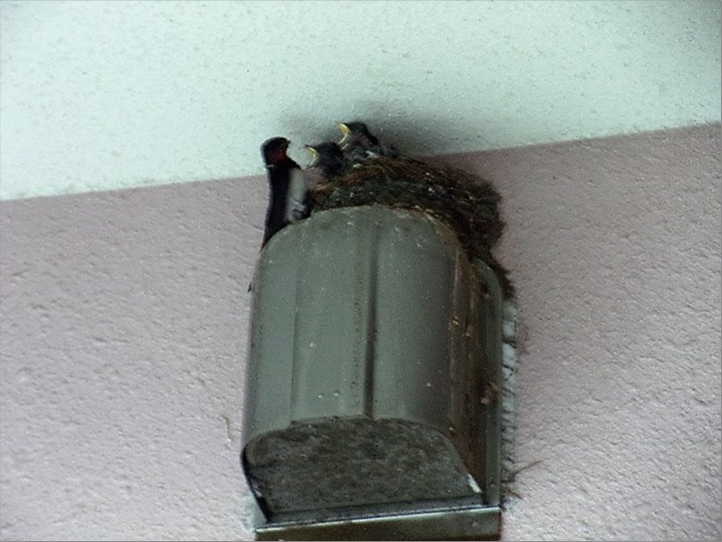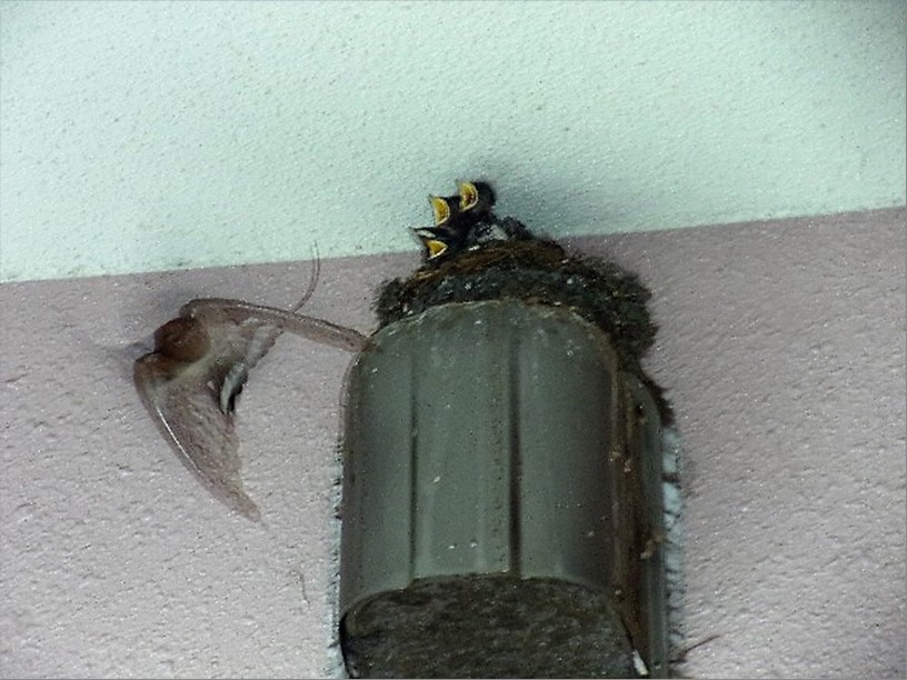 ふと、施設の出入り口を見上げると・・・ツバメの巣があり、雛が顔を出していました。