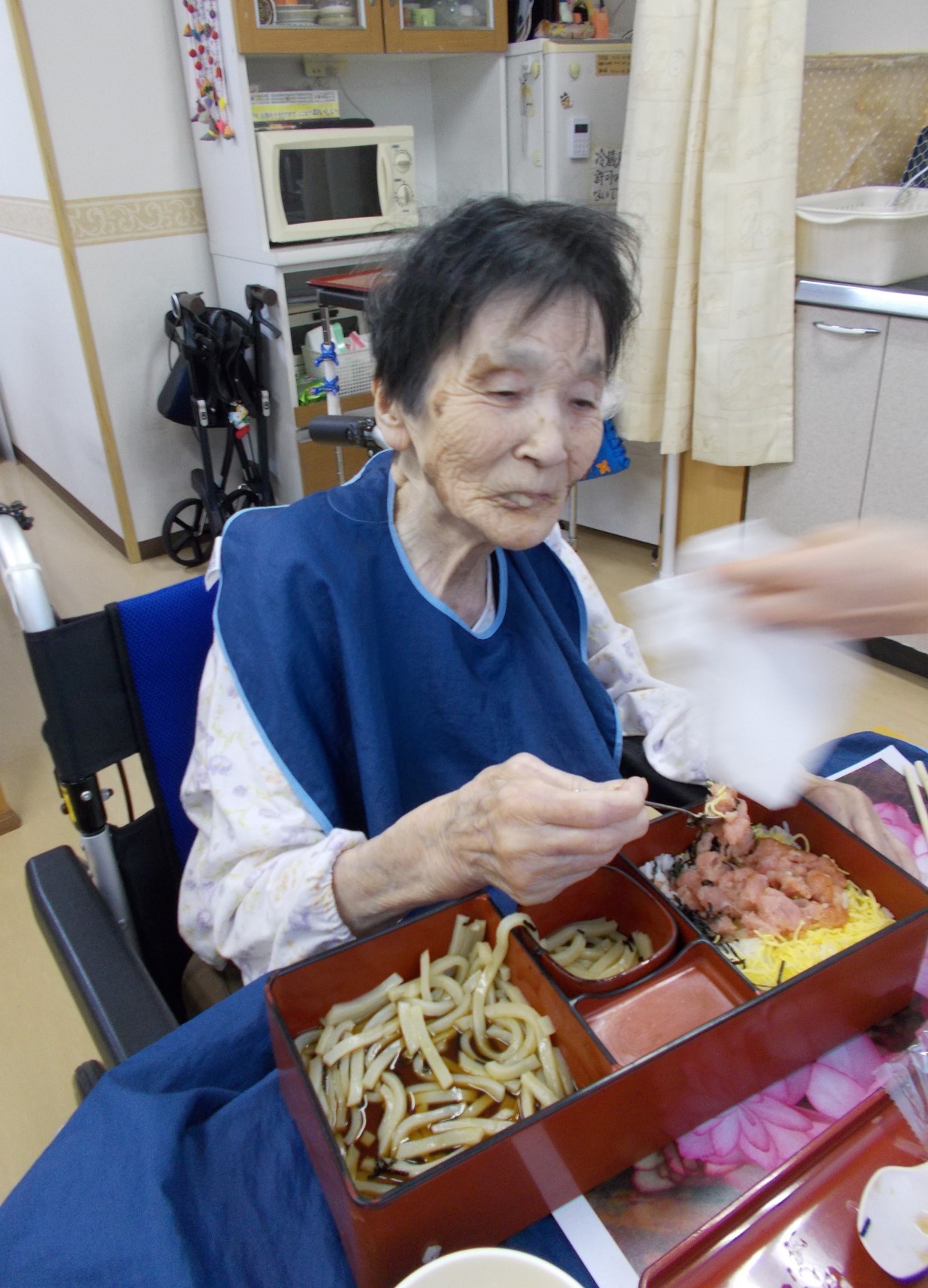 いつもはミキサー食を食べている方も、大好きなお寿司という事もあり、ネギトロ丼とうどんをペロリと食べてしまいました。