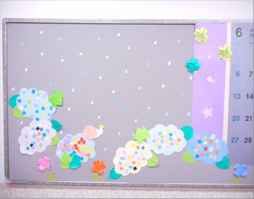 皆様に手伝っていただいて、掲示板の空いていた所に以前のレクで制作した紫陽花を貼らせていただきました。