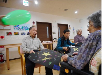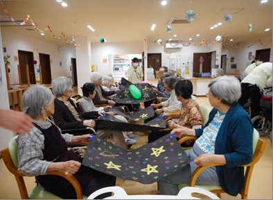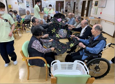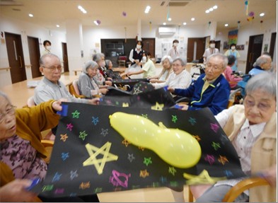 入居者の皆様で天の川を模した模造紙を二人ペアで持って頂き、その上をタイム内に何個の風船を送れるかを競うゲームとなっております。