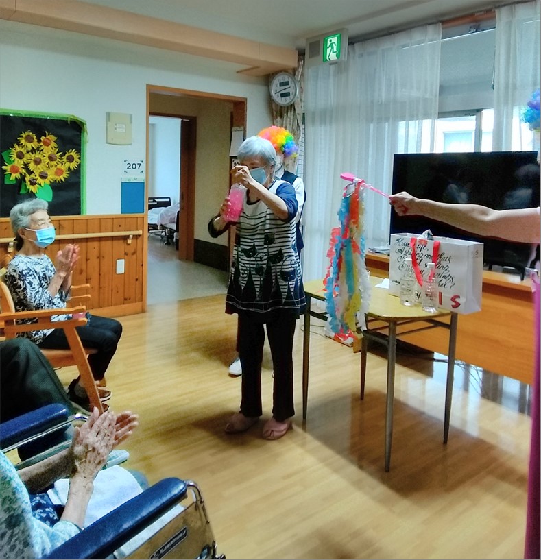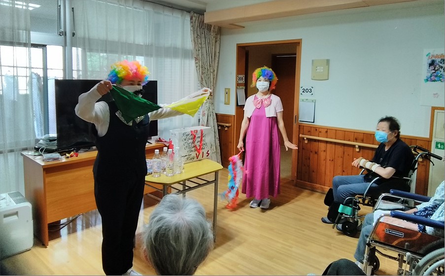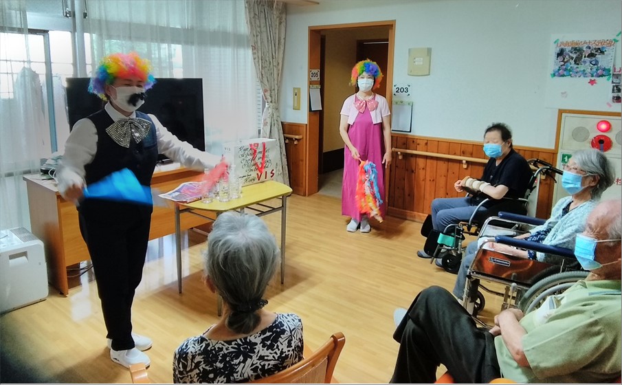 ショートステイの職員が練習を重ねてステージに立ちました。アシスタント(ピンク魔法使い)も職員です。
