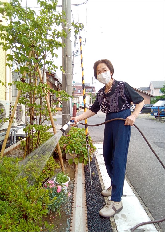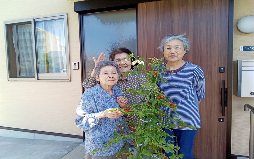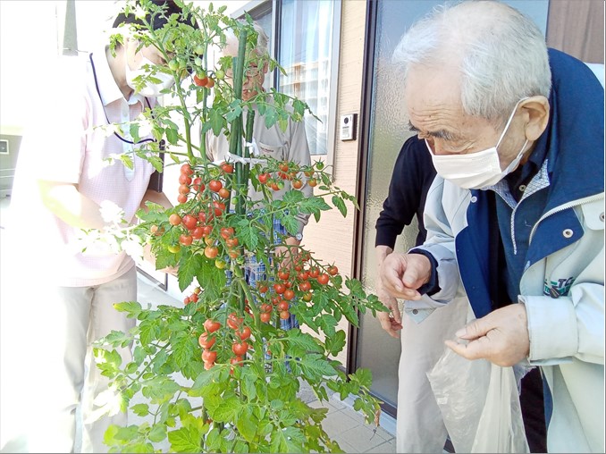 施設で育てているトマトや茄子に毎日交代で水やりを行い、収穫も順調です。