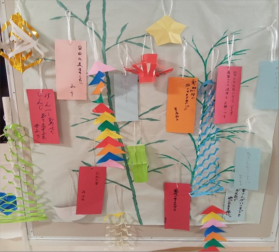 七夕会では短冊に願い事を書き飾り付けました。七夕の由来とその物語については、クイズ形式にて学びました。