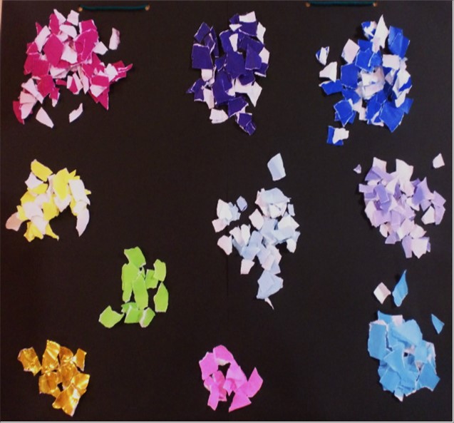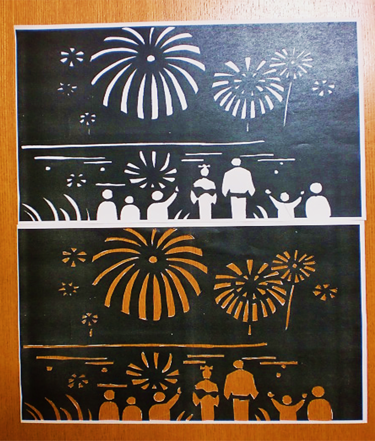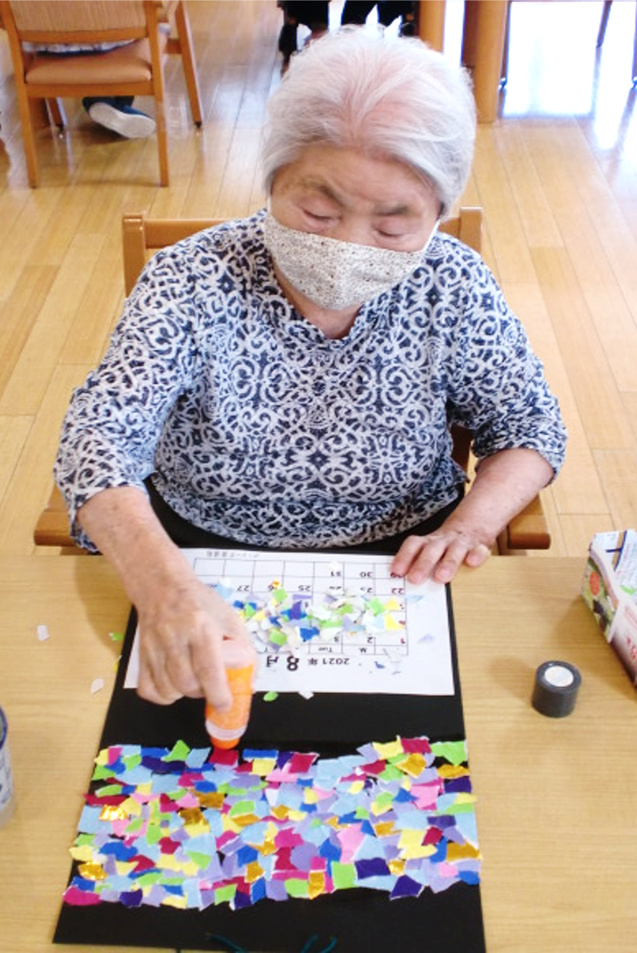 ご利用者様には、小さくちぎったカラフルな折り紙を黒い台紙にたくさん貼って頂き、その上から切り抜いた花火の上紙を貼り完成です。