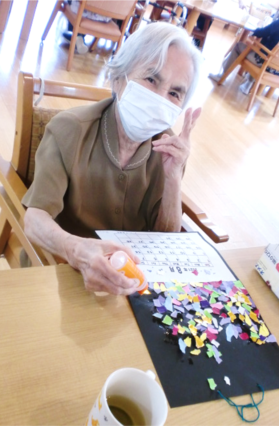 ご利用者様からは、「これ全部貼るの?」や「少し休憩しないと…」とお疲れの様子や声が聞かれていましたが、完成が近づくにつれて皆様、「ここも貼ろうかしら」と完成を楽しみにされておりました。