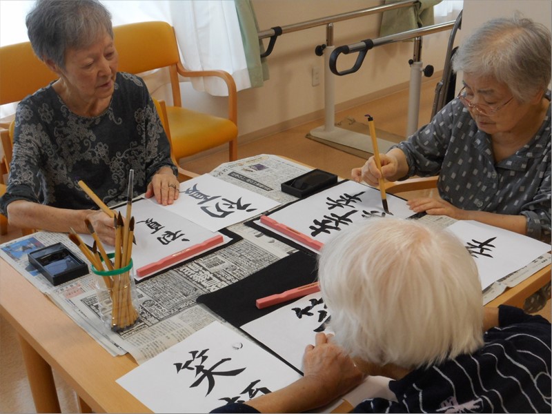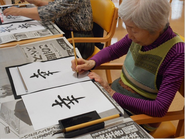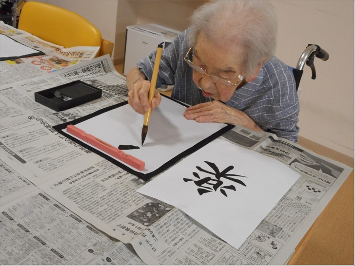 書いてる最中、「○○さん、上手ね~。」「この字は難しくて書けないわよ。」なんて仰るご入居者様も書き始めると上手い!うまい!!