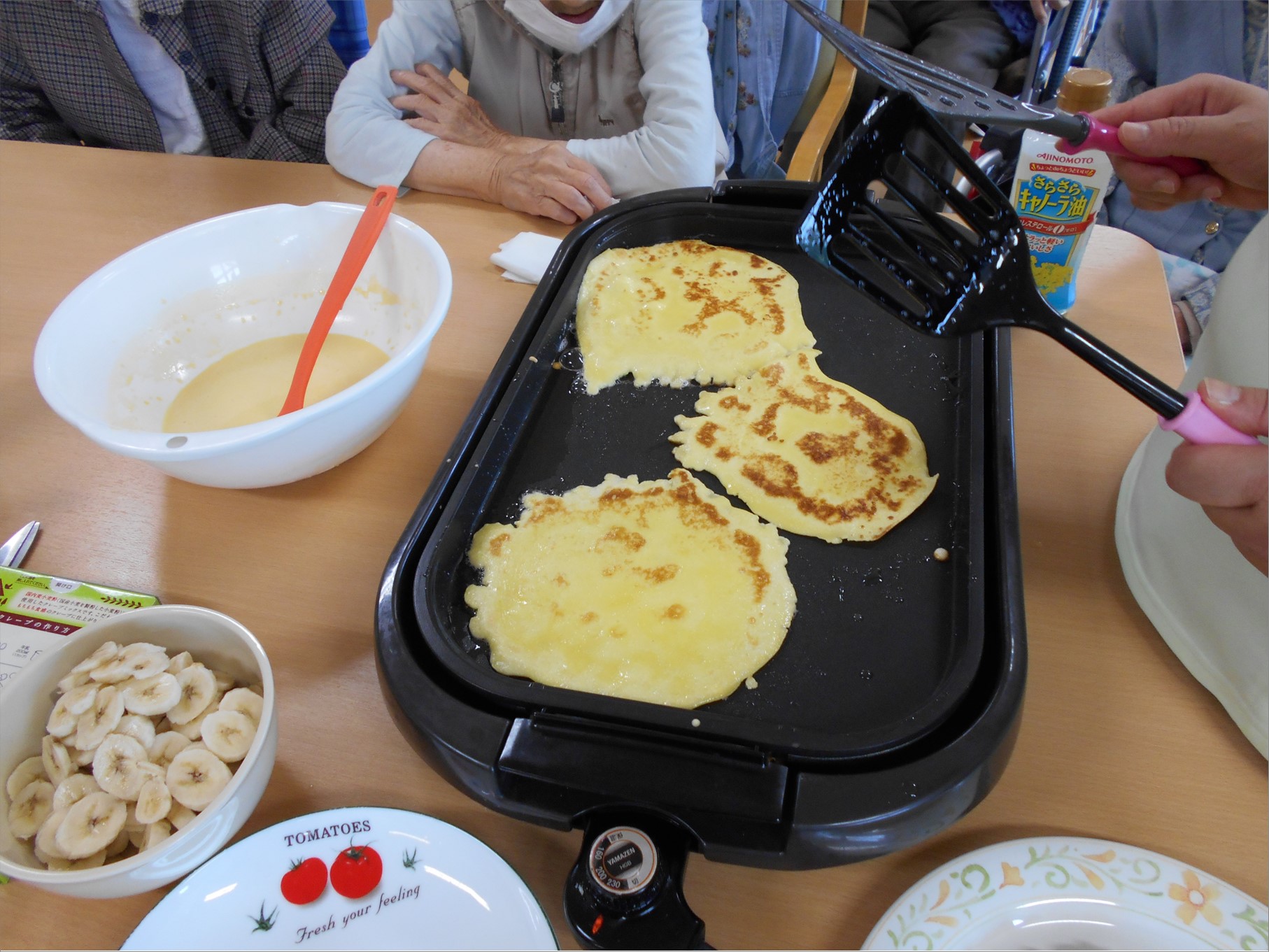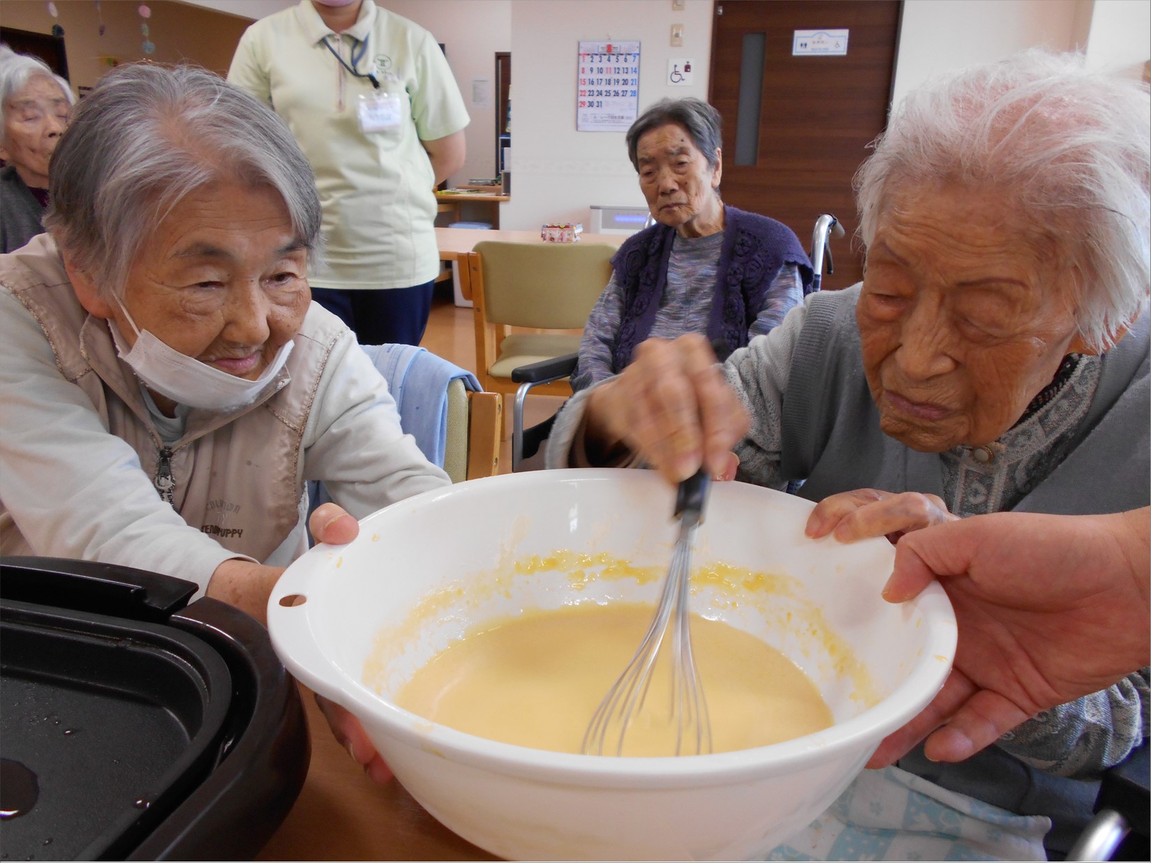ご入居の皆様で力を合わせて粉をこね、ホットプレートで生地作り。