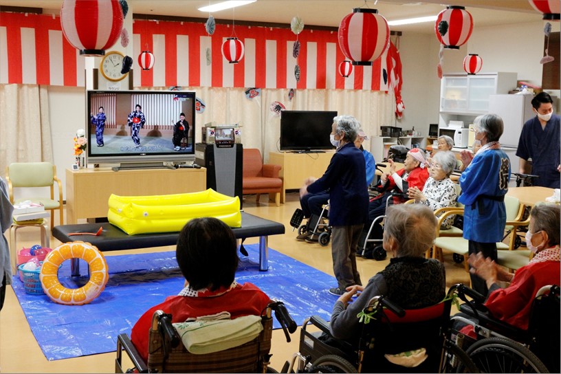 コロナ禍のため、残念ながらご家族の皆様をお迎えすることが出来ませんでしたが、祭り囃子のBGMの中、ご入居の皆様には元気にご参加いただき、「射的」や「ヨーヨー釣り」、「すいか割り」など…