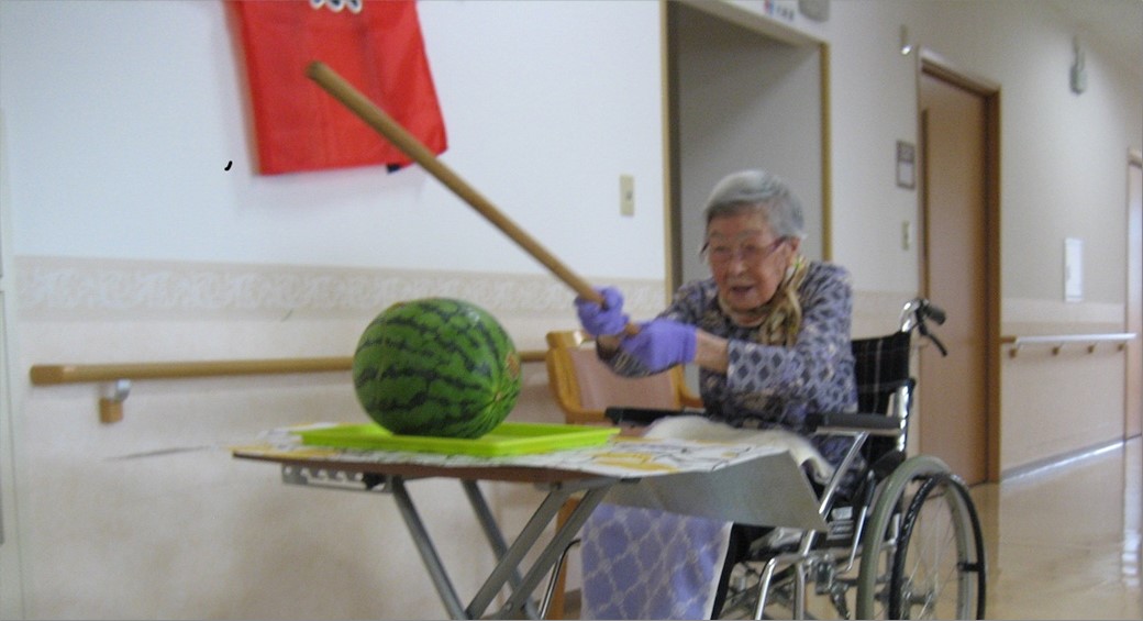 『ル・レーヴ花見川』では夏の終わりを惜しみつつ、ストレス発散! ということでスイカ割りを行いました。