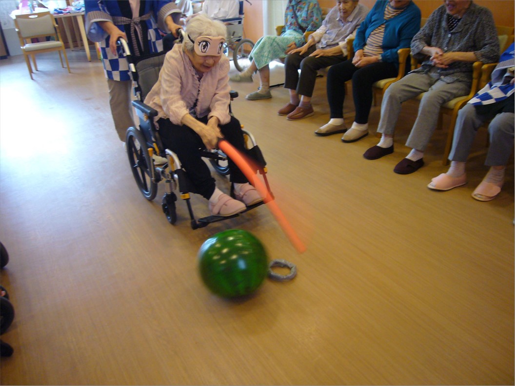 職員の「スイカ割り」のデモンストレーションに大笑い!