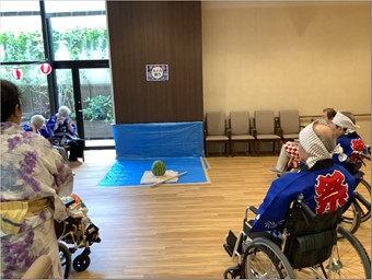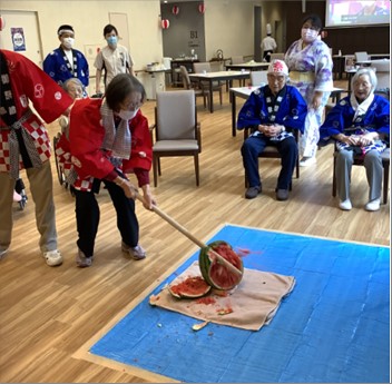 大きなスイカを皆さんで代わる代わる棒でたたき、割れた時の歓声が大きく非常に楽しんで頂けました。