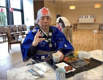 昼食はお祭りメニューとして焼きそば、豚汁、フランクフルト、じゃがバター、フルーツをご用意し、屋台らしさを出すために、あえて紙パックや紙皿などの簡易的なものでお出ししています。