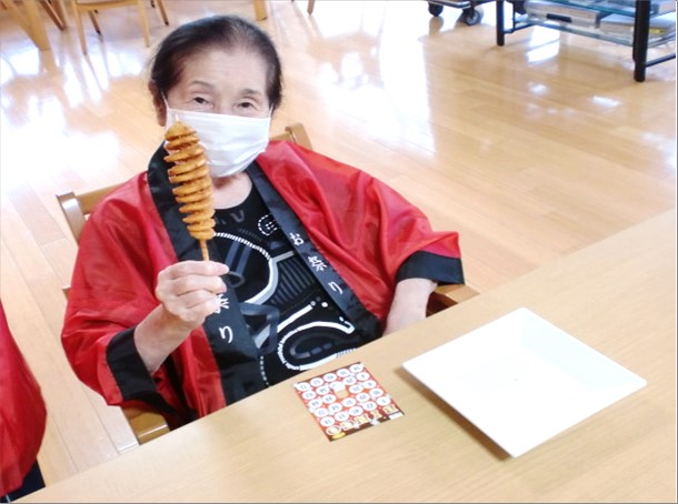 夏祭り後は、サプライズでトルネードポテトをお召し上がり頂きましたが、お祭り気分をより一層味わって頂くために専用の台座を作成し、ご利用者様には好みの物を取っていただきました。
