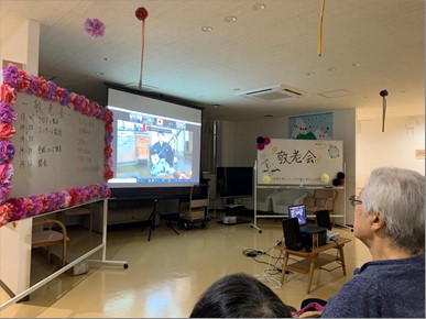 今年の敬老会はなんと、同じグループ施設「ル・レーヴ狭山」ご入居者様と一緒に、唄&三味線コンサートをオンラインにて拝聴致しました。