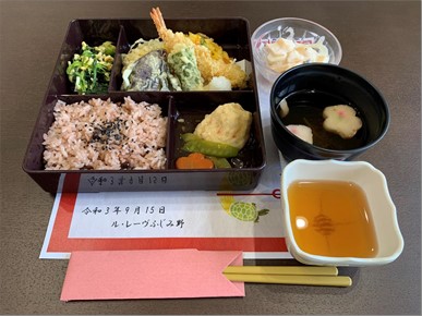 昼食も特別メニューとして「お赤飯」「天ぷら盛り合わせ」「錦糸和え」「柿とレーズンのサラダ」を、ちょっと豪華なお弁当箱にてご提供させて頂いております。