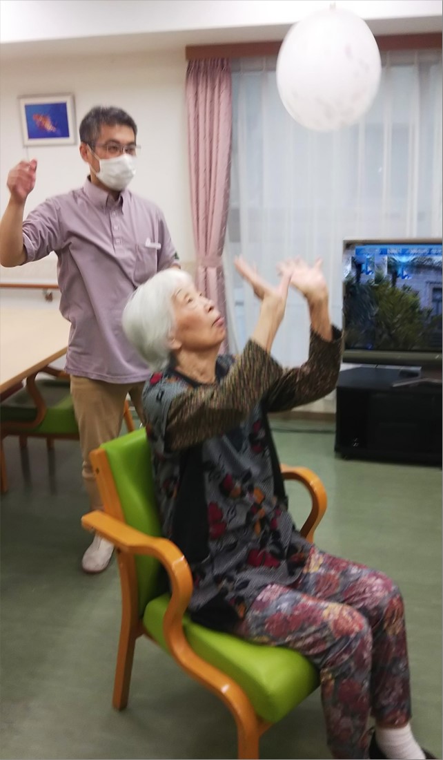 サ高住(2・3階)と特定施設(4・5階)の各階ごとに、風船を落とさずに何回連続して打ち合う事が出来るか?の記録を競うものです。