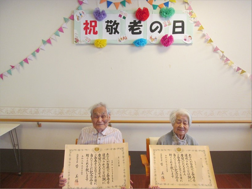 今年はめでたく100歳になる方がお二人いらっしゃいました。総理大臣からの賞状をもってニッコリです。