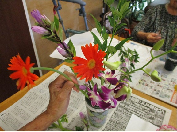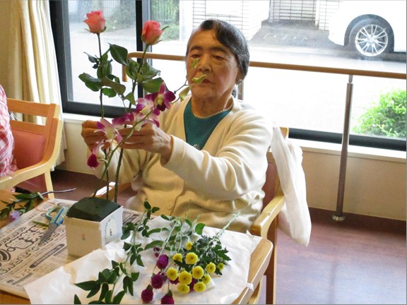 「はさみ貸してちょうだい」「もうやっていいのよね」と、目の前のフラワーベースのスポンジに早速お花を、挿す!挿す!挿す!