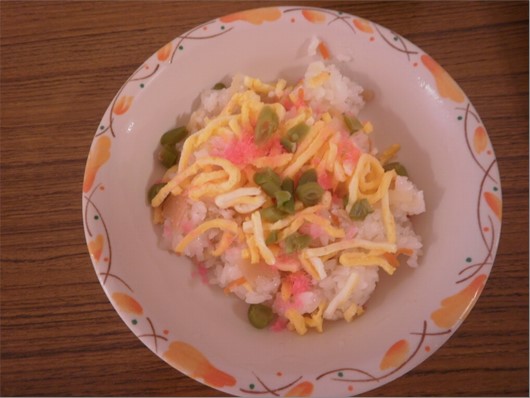 お祝いメニューは『ちらし寿司』が出て、錦糸玉子や紅生姜等が飾ってあり、見た目も華やかで皆様に大変好評で、『おいしかったよ』と、良い笑顔で教えて下さる方も居られました。