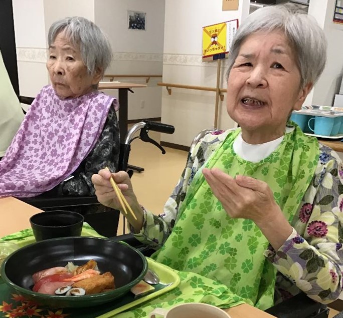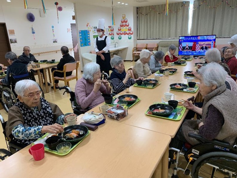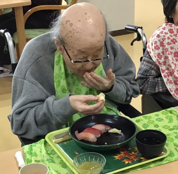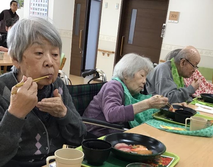 私たち職員も驚かされたのは、普段のお食事ではお箸を使う事が困難と思われていたあるご入居者様が、自ら率先してお箸でお寿司を摘ままれ、少し手を震わせながらもお口までしっかり運べておられた事です。
