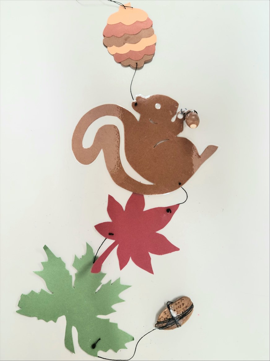 玄関には、様々な色・形をした落ち葉や、本物のくるみと一緒に切り絵で作られたリスが飾られています。