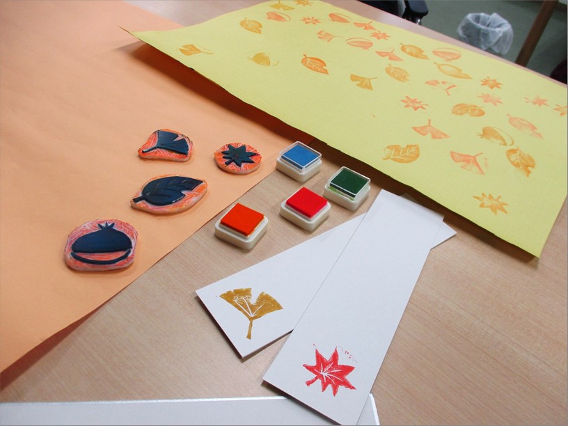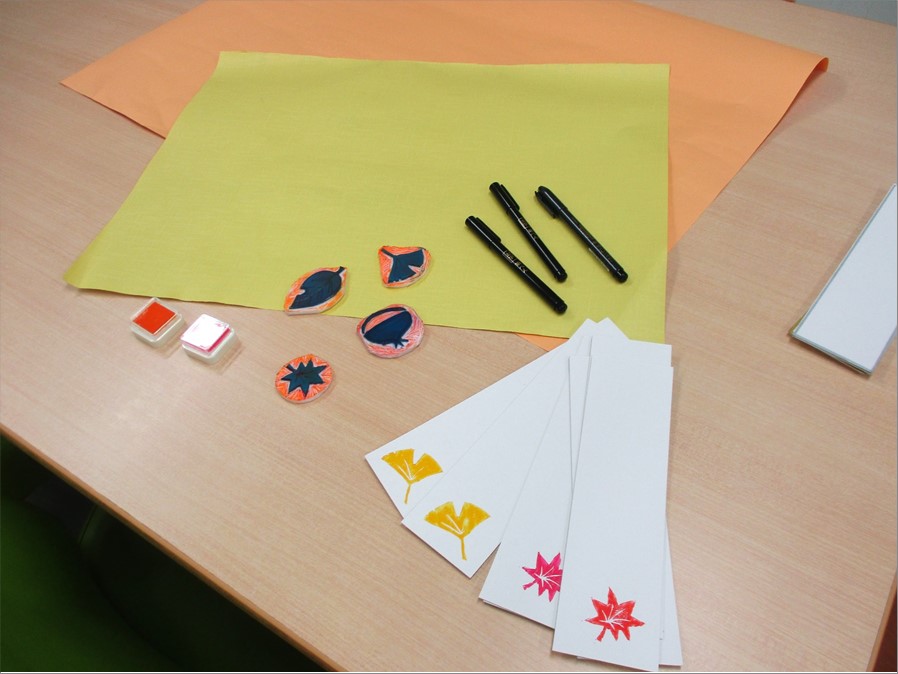 今回使用する短冊には秋を感じさせるデザインの手作りハンコ(職員作)を押しました。