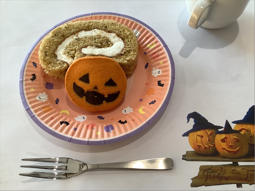 ハロウィン当日は、カボチャのクッキーとロールケーキをご用意させて頂き、入居者様同士で談笑をしながら召し上がって頂きました♪