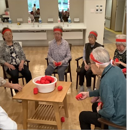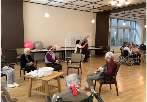 チームごとに玉入れを行いましたが、皆さんの要望もあり最後は全員輪になって玉入れをしました!