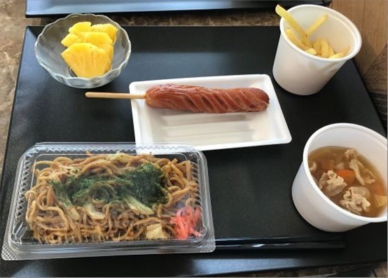 本日は納涼祭ということで昼食は『焼きそば』、『フランクフルト』、『ポテトフライ』、『豚汁』、『フルーツ』を提供しました。