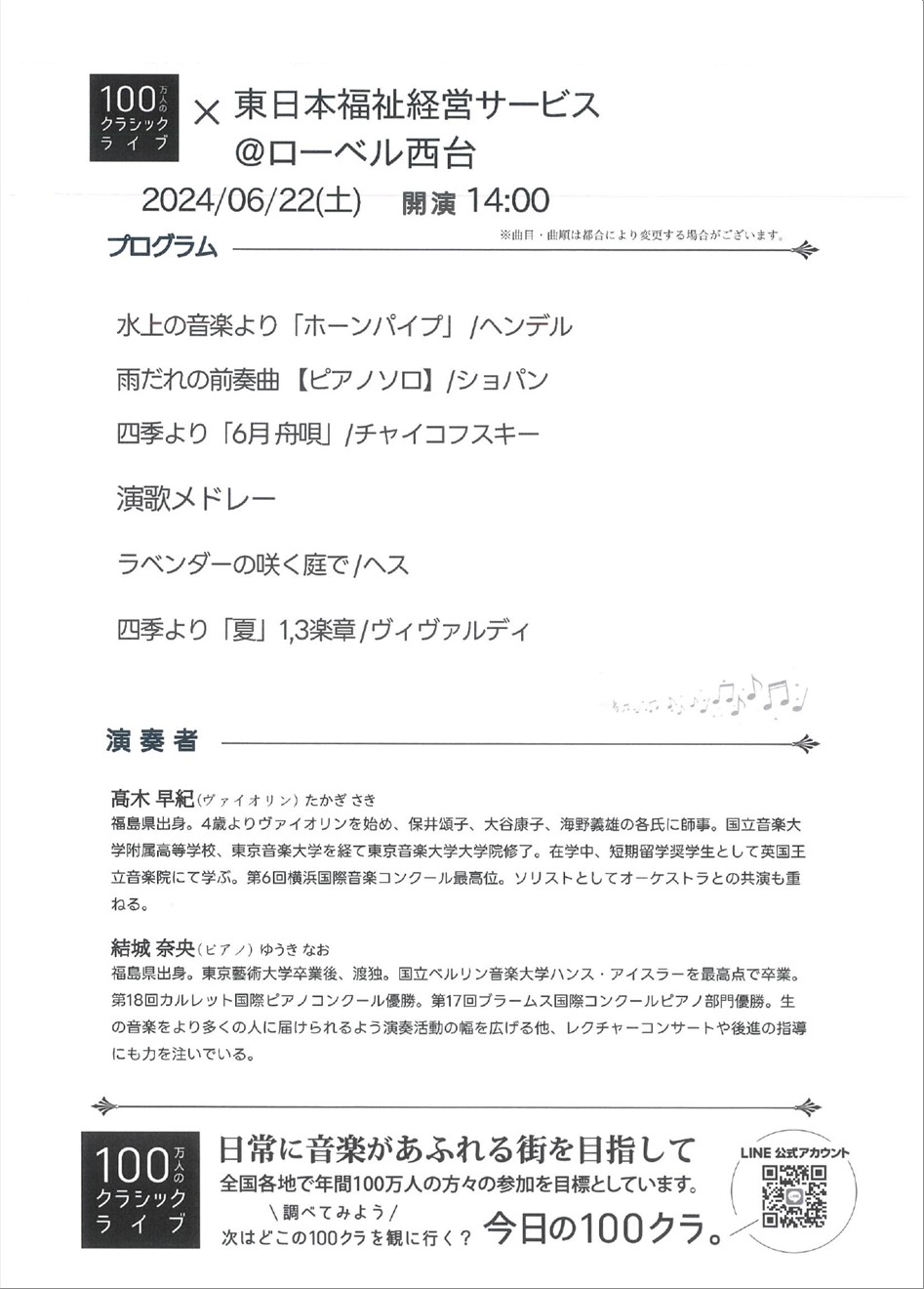 6月22日(土)、「ローベル西台」にてクラシックコンサート♬を開催致しました。