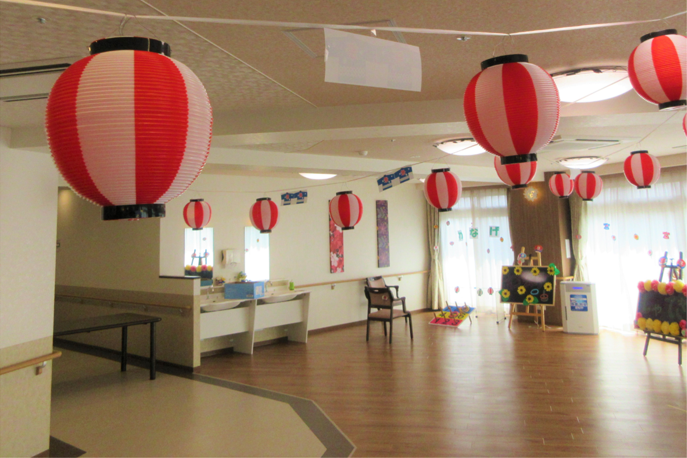 またお祭りの雰囲気を味わっていただくために、はっぴや甚平を着ての写真撮影や、提灯や飾り付けで会場作りを行いました。