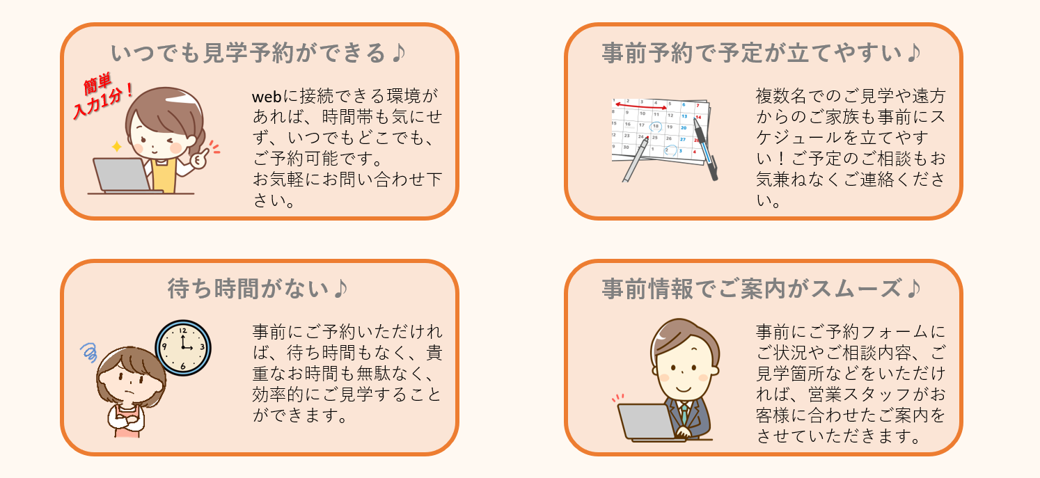 ご見学時によくある質問 Webからの見学予約の4つのメリット Webからの見学予約~ご見学までの流れ ※入力フォームはこちらから Mail formメールフォーム お名前必須 お名前フリガナ TEL必須 メールアドレス必須 お問い合わせ内容 個人情報保護方針の内容に同意する 確認画面へ
