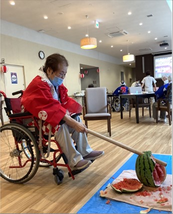 大きなスイカを皆さんで代わる代わる棒でたたき、割れた時の歓声が大きく非常に楽しんで頂けました。