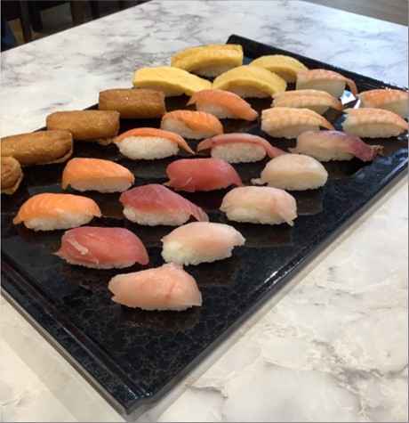 ネタは、中トロ、ビントロ、赤身、サーモン、ぶり、海老、玉子、稲荷で、やはり中トロとぶりが人気でしたね。
