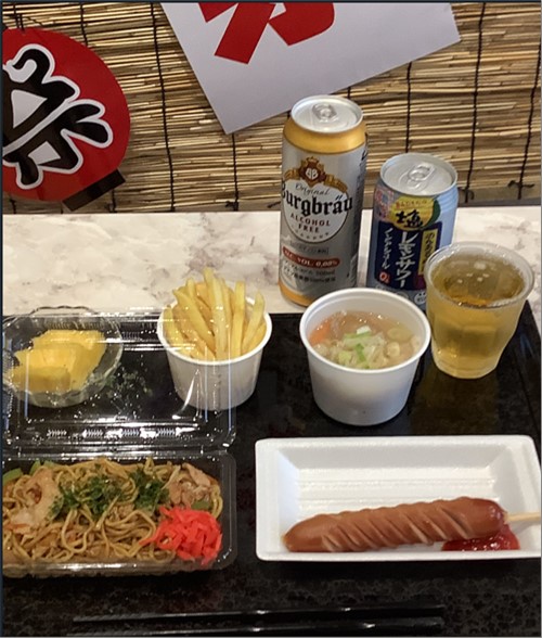昼食はやきそば、フランクフルト、フライドポテト、豚汁、パイナップルといつものものと違い、祭りの屋台風のメニューを提供させていただきました。